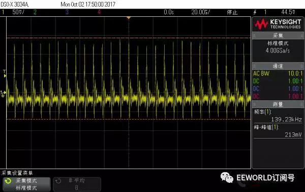 上面兩圖對(duì)比:隨著電流增大,開(kāi)關(guān)頻率變大,但是紋波峰峰值反而有所下降,不過(guò)都在120mV以上 Apple 10W 充電器 1A 帶載波形
