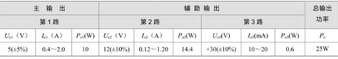 假定要設計的電源適配器具有3路輸出:主輸出Uo1(5V,2A,10W)以及輔助輸出為Uo2(12V,1.2A,14.4W)和Uo3(30V,20mA,0.6W)。總輸出功率為25W,技術指標見表。