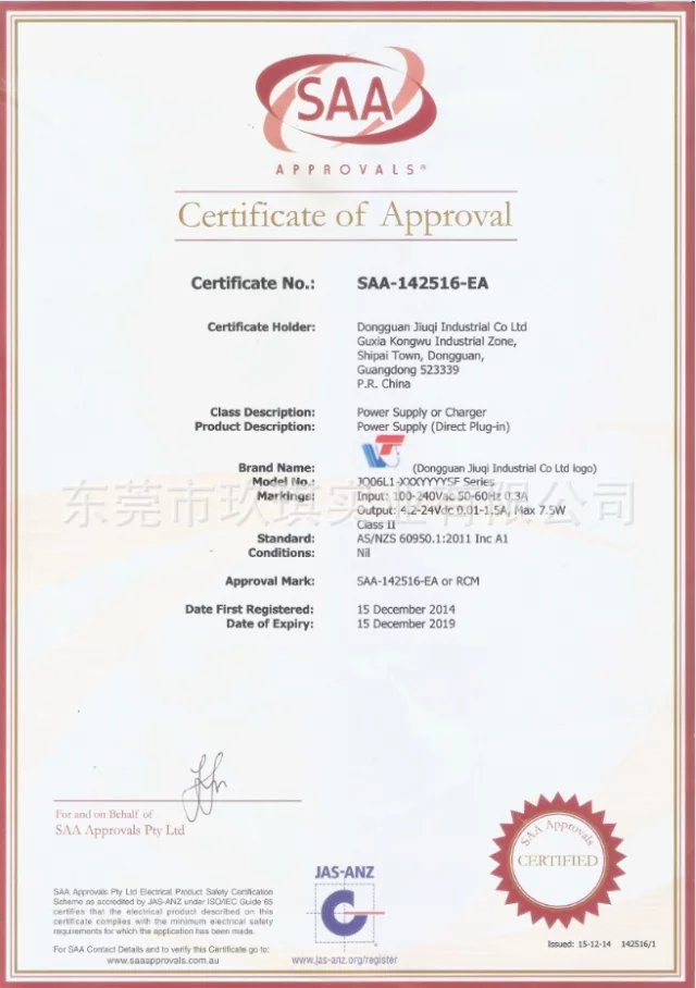 我公司產品目前已獲得國際國內各項知名安規認證;歐盟CE 認證,ICEE CB認證,中國CCC認證PSE GS SAA MEPS ERP等;且后新款產品的認證正在申辦中。